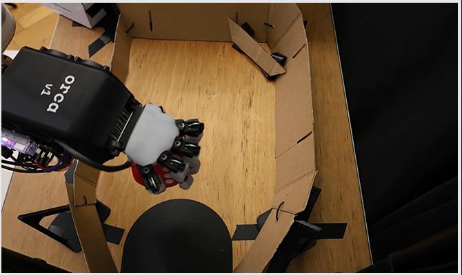 为验证 ORCA v1硬件平台可靠性,本研究设计了持续抓取-放置任务。机械手抓取立方体并置于滑动表面,立方体随机滑落以自动重置环境。