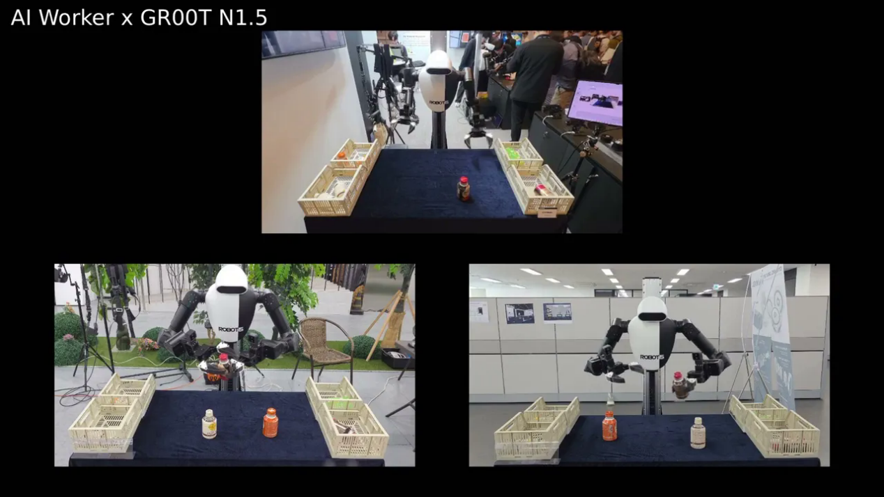 我们的AI Worker展示了如何运用NVIDIA GR00T N1.5模型与双机械臂实现对不同咖啡瓶的分拣。