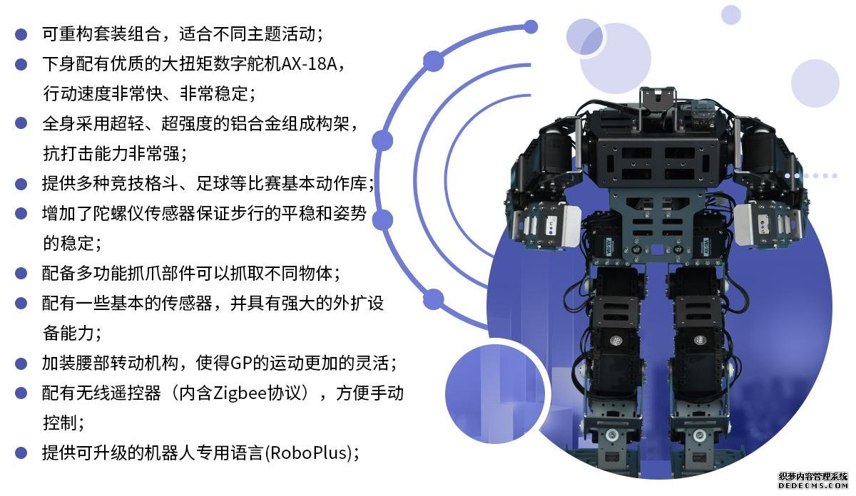 ROBOTIS GP是一款性能突出、躯体强硬、外型威武的人形智能机器人。具有从简到深多种编程方式,适合不同阶段同学使用。GP配有高性能AX-12A和AX-18A数字舵机,以及铝合金架构,它反映迅速、行动敏捷,是参赛用比较好的机器人选择,享有竞技类比赛全能王子称号。