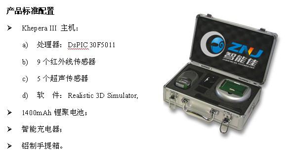 Khepera III是瑞士研发和生产的嵌入式移动机器人,主要用于智能算法和多机器人协作实验。K-III不仅可以在桌面上自由运动,也可在粗糙地面,地毯上运动,它为众多工程学实验提供了完美的解决方案。K-III具有可扩展性,通过外围总线,它几乎可以无限制地扩充功能。