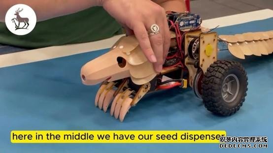 一旦挖好洞,Plantolin就会开过去,同时把一棵紫杉树的“种子炸弹”(基本上是一小块种子和土壤)扔进洞里。这些炸弹通过机器人顶部的孔被送入分配器,并由内部传送带运送到其“屁股”处进行分散。