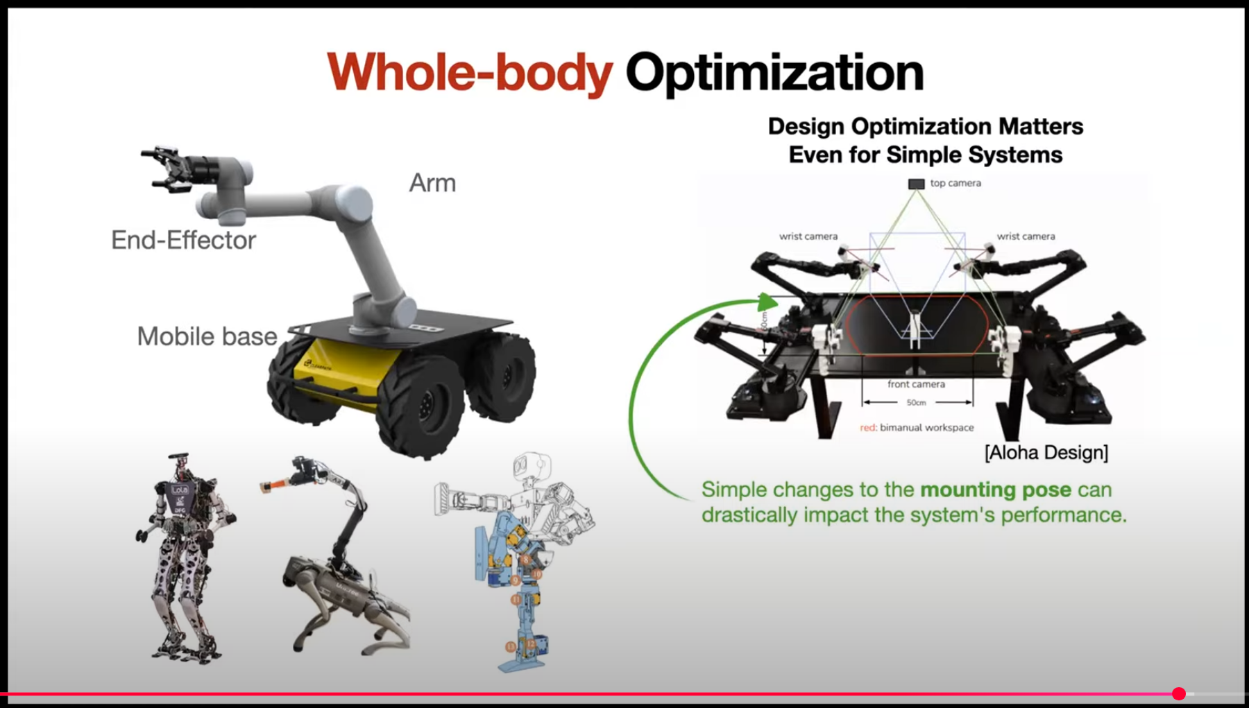 2. 全身协同优化:优化自由度配置、关节位置、非对称结构(如Aloha机器人双臂布局);